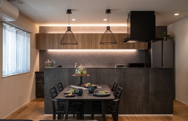 キッチンには大判タイルを採用し、ダイニングには間接照明を配置。